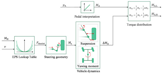 The driver’s desired acceleration is detected via the accelerator pedal position and is distributed equally to the drive torque of the left and right wheel. To take the steering assistance torque into account without influencing the vehicle’s acceleration, the required torque difference is equally superimposed with inverse effective direction.