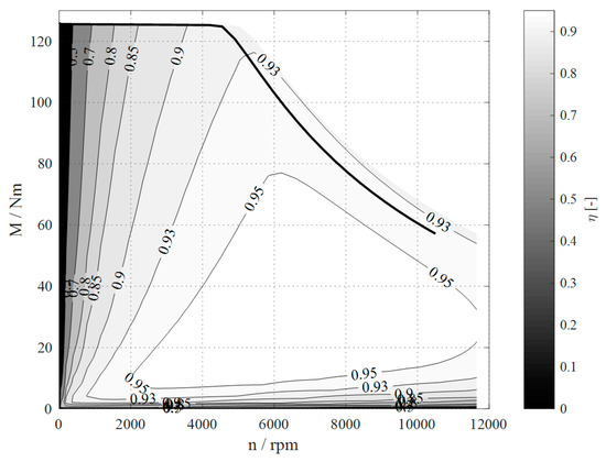 Map of efficiency curves of the electric drives used for simulation.