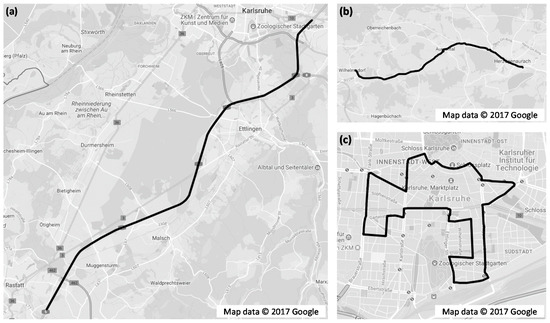Four different types of test procedures are used to analyse the assistance function and energy demand of the steering assistance systems. We use the standardized driving manoeuvres quasi-steady-state circular driving (as per [12]), double lane change (as per [13]) and a slalom course (based on ISO 13674-1 [14] to cover driving situations encountered frequently and relevant to vehicle design and one self-designed procedure (realistic driving cycles) to obtain realistic information about the energetic effects of the novel power steering system. The procedure to obtain realistic information consists of three different realistic driving cycles on basis of city and out-of-city trips in Germany (see Figure 5). Driving cycle (a) models a motorway trip near Karlsruhe of approximately 25.5 km. Driving cycle (b) models a highway trip near Herzogenaurach of approximately 12.5 km. Driving cycle (c) finally represents a trip through the city of Karlsruhe of approximately 13 km length.