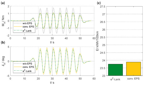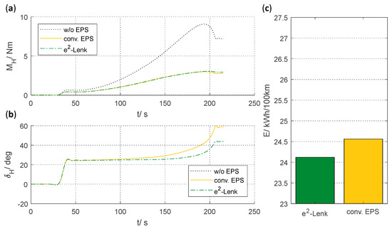 The slalom-weave manoeuvre simulates a situation with constant need of steering over a long period of time with moderate lateral accelerations. Without steering assistance, a steering wheel torque of up to (see Figure 9a) occurs, which can be reduced by both assistance systems by approximately 0.6 Nm. The steering wheel angle without steering assistance and with use of conventional EPS is identical (see Figure 9b), while the e2-Lenk system reduces the maximum steering wheel angle by approximately 12%. Furthermore, e2-Lenk reduces the energy requirements by (see Figure 9c) compared to the conventional system. The result of driving manoeuvre show, that the vehicle is stable over long steering actions with e2-Lenk.
