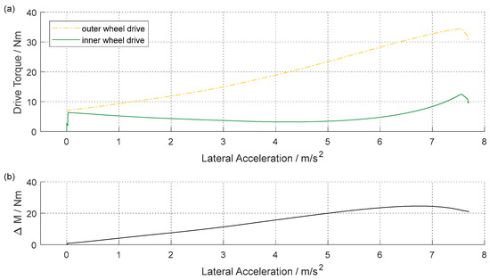 Steady-state circular operation represents a sophisticated driving manoeuvre for the e2-Lenk approach regarding energy demand. As very little longitudinal acceleration of is necessary to maintain the slight increase in lateral acceleration , the mean driving torque of the vehicle is very low. Roemer et al. [15] showed that with conventional chassis parameters the inner wheel drive has to use recuperation mode to achieve the required differential torque at lateral accelerations of .