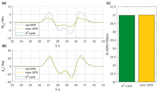 In double lane change, steering movement and high vehicle speed cause lateral accelerations of . In this case, the absence of steering assistance causes a steering wheel torque of up to (see Figure 8a). Both assistance systems clearly reduce the driver’s steering effort by decreasing steering wheel torque by up to approximately 3.5 Nm. The assistance is almost identical in both systems except for a minor deviation in the case of rapid steering to one lane and switching back to the first lane. The root mean square deviation is , with a maximum deviation of . Moreover, the e2-Lenk process reduces the required steering wheel angle by up to approximately 16% (see Figure 8b). Despite the high dynamic demands on the driving motors, the e2-Lenk process reduces the energy requirement compared to the conventional system by (see Figure 8c).
