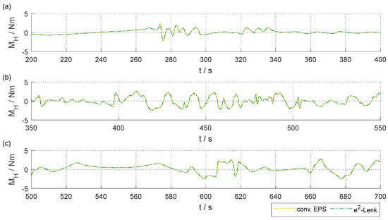Excerpts of steering wheel torque over time: (a) Karlsruhe motorway, (b) Herzogenaurach highway and (c) within Karlsruhe.