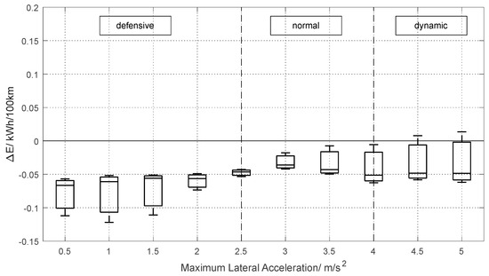A comparison of the energy demand of the e2-Lenk process and of a conventional steering assistance system is shown in Figure 11. A box-whisker plot was drafted for the three realistic driving cycles within a defined maximum lateral acceleration of the virtual driver. This shows the potential of the e2-Lenk process especially in a defensive mode of driving (the classification of types of drivers follows [16,17]). In this way, energy demand in lateral acceleration ranges below can be reduced compared to conventional steering assistance systems by up to respectively approximately 0.95%. Even in a dynamic mode of driving, energy demand can be reduced as a function of driving manoeuvre. This results in a median energy demand reduction in a range of approximately 0.28–0.64% with a mean median value of approximately 0.43%.