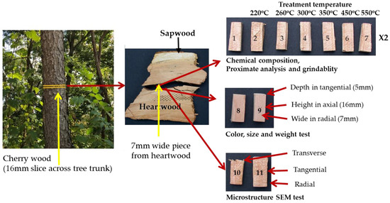 Cherry wood (Prunus serotina; identification based on bark and wood), obtained locally in Pittsburgh, Pennsylvania, was selected as a model for this study. This relatively fast growing species is very common throughout the eastern United States and Canada and therefore has potential to be utilized as a biomass source. The wood samples used in this study were prepared by the following method (Figure 1). First, a 16-mm thick slice of wood was cut across the grain (longitudinal cell); second, an approximately 7 mm tangential section was split from the heartwood along an annual ring; and, finally, eighteen pieces having dimensions of about 16 mm × 7 mm × 5 mm (length, width, thickness) were split from the section. Samples were produced by splitting to avoid saw blade damage to the surfaces. The purpose of taking the samples from a single tangential section in the heartwood was to limit the effects of the natural variability of the wood and improve the reproducibility of results. For the eighteen samples (as illustrated in Figure 1), fourteen samples (1–7) (two sets) were used for biochemical composition/cell wall composition (1 set of 7), and proximate analysis and grindability (1 set of 7). Two samples (8–9) were used for the physical properties tests (weight, color, and size), and two samples (10–11) were used for the microstructure SEM analysis.