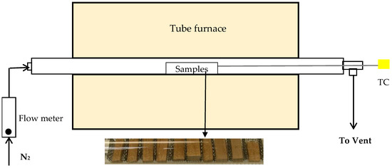 Figure 2 shows a schematic diagram of the thermal treatment experimental setup. The cherry wood samples were successively treated at 220, 260, 300, 350, 450 and 550 °C for 0.5 h for each temperature under flowing nitrogen in a quartz tube furnace. The samples were placed in a holder (Figure 2) and loaded into the middle of the tube at a fixed location and continuously purged with N2 at a 50 mL/min flow rate for 0.5 h at room temperature to remove oxygen. Once the furnace reached the target temperature measured with a thermocouple, the quartz tube with the samples was placed in the furnace. When the samples reached the selected temperature, which was measured by a thermocouple placed close to the sample holder, they were held for 0.5 h. The treatment time was the same for all treatments since the treatment temperature is the more critical variable for torrefaction [15]. It was selected based on previously reported woody biomass torrefaction [22] and low temperature pyrolysis studies [12]. Torrefaction time is normally less than 1 h because the biomass thermal decomposition rate is initially fast, slowing after about 1 h [15]. A half hour was selected as the optimal time for torrefaction based on the improvement of grindability, the mass and energy yields [22]. A half hour treatment time was also used in a study of forest biomass grindability and fuel characteristics at torrefaction temperatures from 225 to 300 °C [20]. After the 0.5 h treatment, the tube was removed from the furnace and quickly cooled to room temperature under flowing N2. The treated samples were stored in a desiccator.