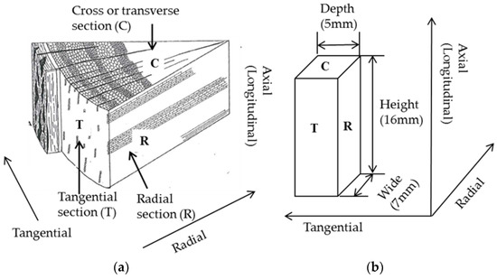 (a) Illustration of a section of wood showing the three planes discussed [39]; (b) Schematic of a wood sample used for these tests with the dimensions and orientations indicated.