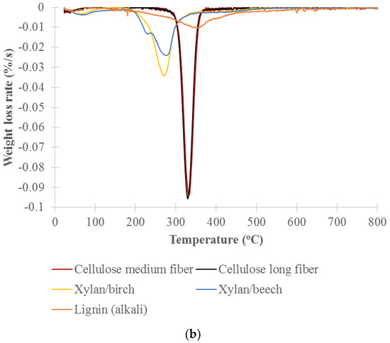 TGA analysis of the decomposition of pure cellulose, xylan and lignin was used to identify the temperature ranges that will be used for the cell well composition analysis of untreated and treated woods. Figure 4 shows the thermogravimetry (TG) and the differential thermogravimetry (DTG) curves vs. temperature for long and medium cellulose fibers, xylans from beech and birch wood (representing hemicelluloses) and lignin (alkali). The DTG curves show a distinct primary peak for each model component. Xylan from birchwood and xylan from beechwood decomposed over the range of about 200 to 300 °C with peak maximums at 269 and 274 °C, respectively. The long and medium cellulose fibers mainly decomposed over the range of about 300 to 360 °C with peak maximums at 330 and 328 °C, respectively. Lignin slowly decomposed over the range of about 200 to 800 °C with a peak maximum at 353 °C. The hemicelluloses are the most thermally sensitive of the main biomass components. Yang et al. studied pyrolysis of hemicellulose (xylan from birchwood), cellulose fiber and lignin (alkali) and reported that xylan decomposed at 220–315 °C with peak maximums at 268 °C, cellulose fiber at 315–400 °C with peak maximums at 355 °C, and lignin at 150–900 °C [43]. Our results showed a lower decomposition temperature due to our lower heating rate of 2 °C/min versus their 10 °C/min. The peak maximums of celluloses measured by both TGA and DSC were comparable. The peak maximums observed for the xylans and lignin by TGA were slightly lower than those measured by DSC but still fell in similar decomposition temperature ranges.