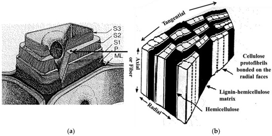 (a) Illustration of three main regions in the cell wall: the middle lamella (ML), the primary wall (P), and the three layers of the secondary wall (S1, S2 and S3) [44]; (b) Proposed ultrastructural model of the arrangement of hemicellulose, cellulose and lignin in the S2 layer [32].