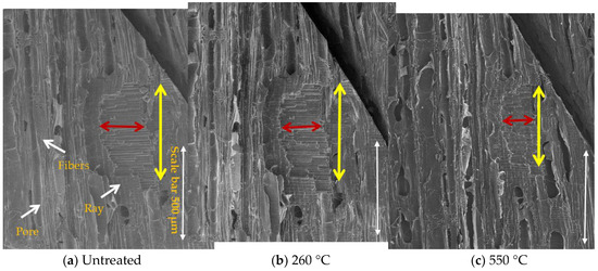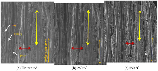 SEM images (horizontal field width = 1.28 mm; scale bar of 500 µm; vertical as images are presented) of the radial section views of the untreated and the 300 and 550 °C treated cherry wood samples. White arrows point out fibers and rays that look like a brick wall crossing in the longitudinal direction, also pores are visible in the radial section images. Yellow bars mark shrinkage along the axial direction (using reference structures). Red bars mark shrinkage along the radial direction (using reference structures).