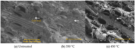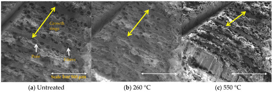 Figure 6 shows the SEM images (horizontal field width = 1.28 mm; scale bar of 500 µm; vertical as images are presented) of the tangential section views of the untreated and the 260 and 550 °C treated woods. There are fibers, rays seen in end-view formed by stacks of ray parenchyma cells and pores visible in the tangential section images. Identified morphological structures were seen in all three woods. Figure 7 shows the SEM images (horizontal field width = 1.28 mm; scale bar of 500 µm; vertical as images are presented) of the radial section views of the untreated and the 300 and 550 °C treated woods. There are fibers, rays that look like a brick wall crossing in the longitudinal direction and pores visible in the radial section images. Figure 8 shows the SEM images (horizontal field width = 1.28 mm; scale bar of 500 µm) of the cross section views of the untreated and the 300 and 550 °C treated woods. There are many pores of various sizes and arrangements, fibers and annual or growth rings visible in the cross section images. Overall, the morphological features of the wood remain intact during the thermal treatments, which is in agreement with Haas et al. [49] who studied the pyrolysis of poplar wood up to 700 °C using microscopy in real-time and Winandy and Rowell [32] who studied the pyrolysis of pine wood at 295 °C. Figure 9 shows the SEM images (horizontal field width = 320 μm; scale bar of 100 µm) of cross sections of the untreated and the 350 and 450 °C treated samples. The cell walls were thinner after the thermal treatments.