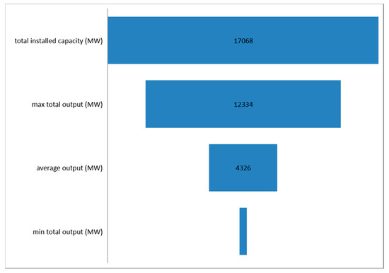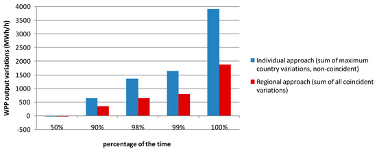A more detailed representation of the Figure 5 would present both positive and negative variations that are almost symmetric. The maximum variation informs the total power reserve capacity requirement. Therefore, considering that the variations in wind energy generation are calculated on a country-by-country basis, which is the current practice in SE region, expected variations range from −4600 MWh/h to +4000 MWh/h. This is equivalent to approximately 27% of total WPP projected to be installed capacity in the region.