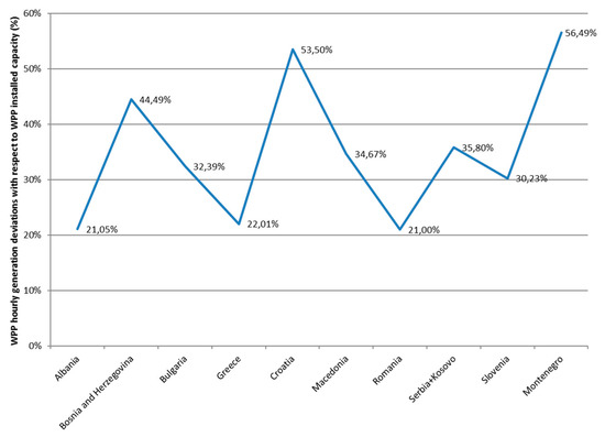 Although most of the SE power systems are not widely spread, the diverse WPP geographical locations in each country and across the region creates large variations in WPP production. Figure 4 presents expected wind energy hourly generation fluctuations (as percent of total wind energy installed power) for each power system in SE region. The hourly variability of WPP production ranges from 21% in Romania to 56% of total WPP installed power in Montenegro.