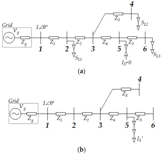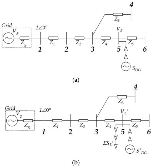 The DG unit is planned to be integrated into the system from Bus-5. As can be seen from Figure 1a, three different base loads located at different positions with respect to the integration point are connected to the system. Thus, it is intended to obtain an expression which is useful for all possible load placements. One of these loads is upstream of the integration point, the other is downstream of that point and the last one has been connected to the system from a point on a different branch other than the branch where the integration point is located.