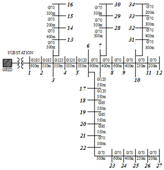 In this study, an application of the proposed mathematical model is demonstrated on a 34-bus test system [40]. The single line diagram of the test system is given in Figure 3. All the lines in the system are overhead lines, and their cross-sections along with the lengths are given in the single line diagram. The system is a radial distribution system, and the nominal system voltage is 11 kV. The system is modelled in the Electrical Transient and Analysis Program (ETAP), which is software developed for power system analysis.