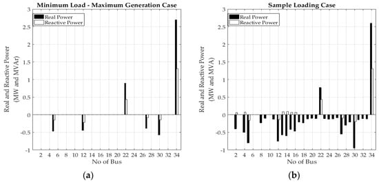 First, the calculation of the maximum permissible DG capacity for the unloaded case of the system () is calculated. Equation (3), which has the most accurate approach among the addressed mathematical models in the study, is used in this calculation. Then, the obtained capacity is improved by including the minimum loads and the maximum generations in the calculations by using the proposed mathematical model. In order to test the effectiveness of the proposed model, a DG unit at the obtained capacities is integrated into the system and a power flow analysis is performed. Each obtained capacity is analyzed for two different loading scenarios: the minimum load–maximum generation case and a sample operation case. Thus, the consistency of the proposed mathematical model is tested. Both scenarios are given in Figure 4.