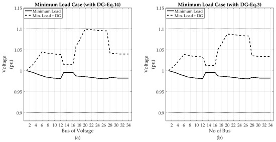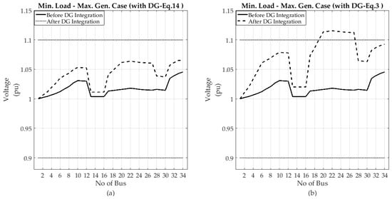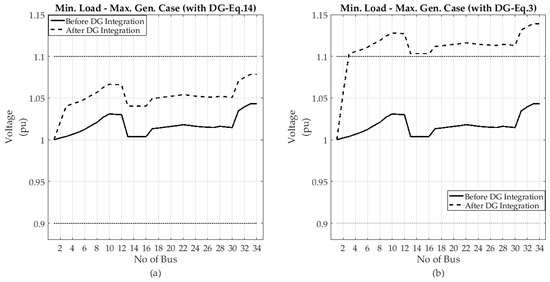 Voltages at the system buses for the minimum load–maximum generation case with and without DG integration from Bus-20 (a) for the DG capacity obtained by the proposed mathematical model (b) for the DG capacity obtained by Equation (3).