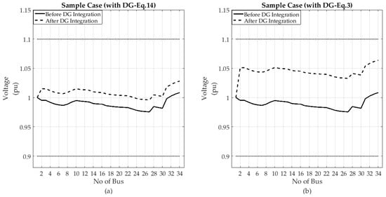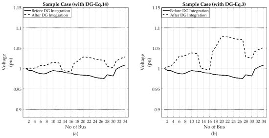 Voltages at the system buses for the sample case with and without DG integration from Bus-20 (a) for the DG capacity obtained by the proposed mathematical model (b) for the DG capacity obtained by Equation (3).