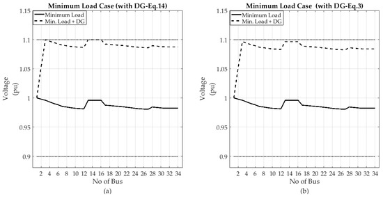 Voltages at the system buses for the minimum load case with and without DG integration from Bus-20 (a) for the DG capacity obtained by the proposed mathematical model (b) for the DG capacity obtained by Equation (3).