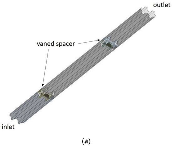 In the typical reactor core, the reactor assembly comprises 17 by 17 fuel rods and about ten spacer grids. It requires too much computational cost to model the whole fuel assembly with 17 by 17 fuel rods, especially for two-phase in fuel assembly. In the past, researchers chose 5 by 5 fuel rods as a simplified geometry to study the single-phase and two-phase thermohydraulics by experiments and simulations. However, it still took up too many computational resources for the two-phase simulation in the assembly with 5 by 5 fuel rods with complicated physical models, such as the two-phase flow with MUSIG model. Fortunately, the arrangement of spacer grid and mixing vane shows some regularity and periodicity. In the work of Li and Gao [19], a two-channel model with three sets of periodic boundary conditions was proposed and compared with the results from a 5 by 5 rod geometry to prove the rationality of this simplification. This two-channel model was also employed in the current work for the purposes of reducing computational cost and obtaining reasonable results. The computational domain is shown in Figure 2. It consists of two channels, two sets of spacer grids and mixing vane. The cross-section connected to the adjacent channels is set to be periodic boundaries to allow the transverse flow to cross these boundaries. Besides, the weld bead as well as components to hold the bundles was omitted to simplify the modeling, since this work is focused on the effects of spacer grids and mixing vanes on thermohydraulics.