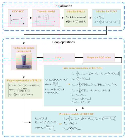 FFRLS-EKF algorithm is proposed based on FFRLS and EKF to estimate SOC with online parameter identification. In the calculation of FFRLS-EKF algorithm, the FFRLS algorithm updates the battery parameters and the EKF algorithm estimates the SOC value. The FFRLS-EKF algorithm can be divided into two parts: initialization and loop operations. In the initialization part, the correspondence between OCV and SOC needs to be obtained from battery tests. The Thevenin model is chosen as the equivalent circuit model. The FFRLS algorithm and EKF algorithm require initial values before starting the loop operations. In every cycle, voltage and current are measured. The FFRLS algorithm runs one step, followed by prediction module and error correction module of EKF. Next, the current SOC value is output. Finally, increase cycle index k by 1. The loop operations will continue to go on.