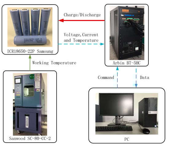 As shown in Figure 3, a test bench is established to verify the effectiveness of the proposed algorithms. ICR18650-22P batteries (Samsung, Seoul, South Korea) are used as the experimental subjects. The specifications of test batteries are as follows: nominal capacity 2150 mAh, nominal voltage 3.6 V, charging end voltage 4.2 V, discharging end voltage 2.75 V and maximum continuous discharging current 10 A. When charging or discharging, C-rate represents constant current 2.15 A for these experimental subjects. For example, charge the battery with constant current 1 C means charge the battery with constant current 2.15 A. A temperature chamber (SC-80-CC-2, Sanwood, Dongguan, China) provides a variable temperature working environment for batteries. The maximum temperature range is −40 °C~150 °C and the accuracy of temperature is ±0.1 °C. A battery testing system (BT-5HC, Arbin, College Station, TX, USA) is used to charge/discharge the batteries within the range of 0 A~30 A and current voltage 0 V~5 V. The control and measurement accuracies of current and voltage are both ±0.02% full scale range. A host computer with MITS Pro (v7.0, Arbin, College Station, TX, USA) installed controls the battery testing system to load the programmed current profiles on the batteries and record the data. The algorithms are validated by experimental data in the environment of MATLAB (R2016b, MathWorks, Natick, MA, USA). In the experiments, the sampling frequency of current and voltage is once per second.