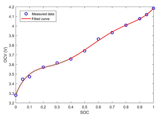 The relationship of open circuit voltage (OCV) and SOC is one of the basic characteristics of lithium-ion batteries which is also measured in the experiments. The experimental method is to rest a battery of specific SOC for long enough time (1 h in this experiment), then the terminal voltage is considered equal to the open circuit voltage. In this experiment, OCV-SOC curve was obtained by selecting 13 SOC values for measuring OCV and polynomial fitting of the obtained points, as shown in the Figure 4.