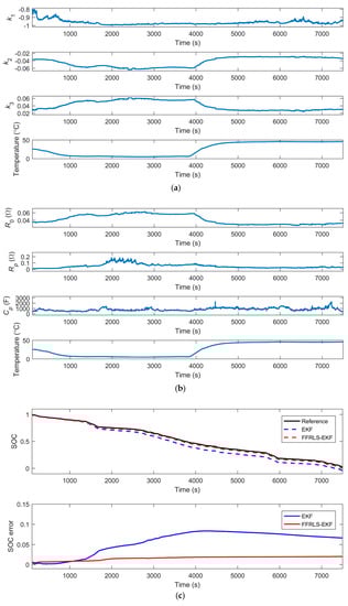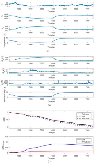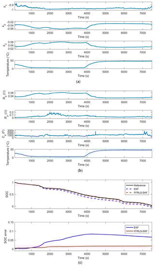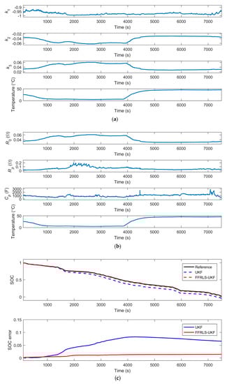Similarly, the data are processed with the UKF algorithm and the FFRLS-UKF algorithm respectively, as shown in Figure 11. The results of the online parameters identification are shown in Figure 11a,b. Figure 11c illustrates the SOC estimation values of the UKF algorithm and the FFRLS-UKF algorithm.