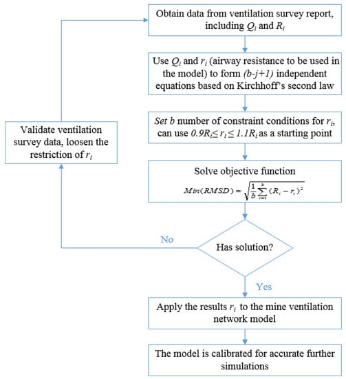 Assuming there are b branches and j junctions in the ventilation network, the measured and simulated airflow quantities in the branches can be denoted as and , and the measured and simulated airway resistances for the branches can be denoted as and . The general processes for the proposed calibration method is demonstrated in the flow chart shown in Figure 1. The first step is to obtain the original airflow quantities and ventilation resistances through consulting the ventilation survey report. Then, based on Kirchhoff’s second law, the actual measured airflow quantities () and the airway resistances () are used in the calibrated MVN model to establish (b – j + 1) sets of independent equations. The constraint conditions used for are within the range of plus and minus 10% of the measured resistance values. The airway resistances () used in the calibrated MVN model can be obtained by solving the objective function, which minimizes the difference between and .