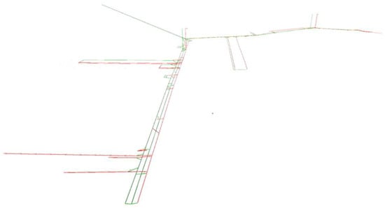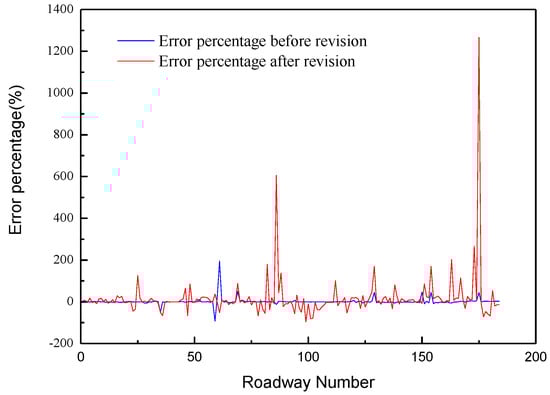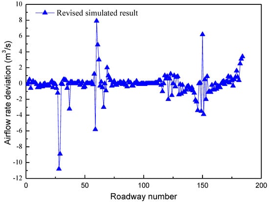 There are 154 junctions and 185 branches in the established MVN model. Therefore, there are 32 independent circuits and each circuit can establish an independent equation according to Kirchhoff’s second law. Thirty-two equations are established according to Equation (3) and the objective function is established with Equation (4). All of the roadways’ resistance are constrained between 90% and 110% of the measured one. With such conditions, the non-linear optimization problem was solved. However, no feasible solution was found. This means that, under the current constraint conditions, there is no set of resistance values that can be found to satisfy Kirchhoff’s second law. Thus, the constraint conditions were loosened to 85% and 115% of the measured resistance. The objective function was solved again and a set of optimal solutions was found after 498 iterations. The calculated set of resistance data was then input to the MVN model for calibration. The airflow simulation was run again, and the new airflow results were recorded. As the revised simulated airflow rate and the measured data are very close, the comparison diagrams are almost identical. The airflow rate deviation is displayed in Figure 4.