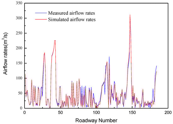 Finally, the airflow simulation was run and the simulated airflow rate was recorded in each roadway. For each airway, the comparison of the simulated airflow rate and the measured data is shown in Figure 3.