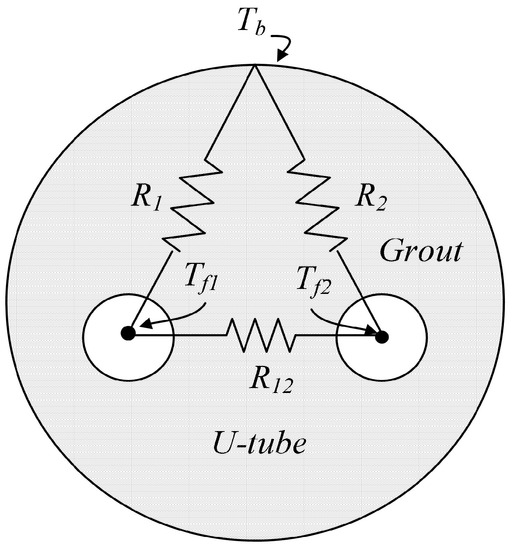 The concept of the effective borehole resistance was introduced by Hellström [6] and is greater than the borehole resistance because the former takes into account the loss of performance due to the short-circuiting effect between the two segments of the U-tube inside the borehole. It is associated with the 2D resistance network inside the borehole. This network is shown in Figure 2 which represents a cross section of a typical borehole with a single U-tube.