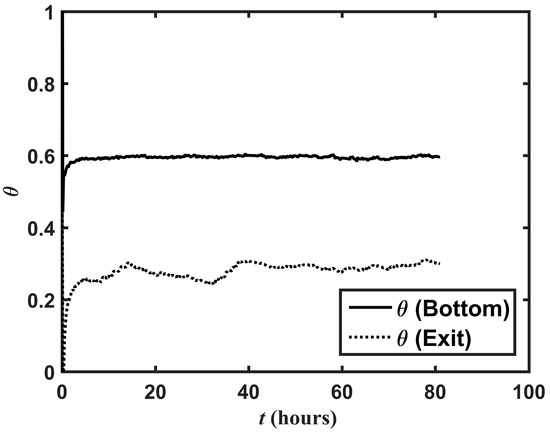 A value of the borehole temperature Tb (t) is needed to solve Equations (10) and (11). This means borehole temperature is not easy to measure. Here, it was estimated using the infinite line source solution from Equation (1) using the subsurface thermal conductivity found during the TRT. Even though the fluid and the borehole temperature are time dependent, in theory, Equations (10) and (11), if valid, should be time independent. To verify that, the measured value of the normalized fluid temperature at the bottom and at the exit were plotted as function of time (Figure 4).