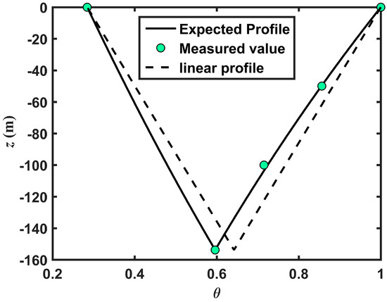 The value became almost constant after approximately 7 h which gives a Fourier number of approximately 6, and is a typical value for the validity of steady-flux regime. In our calculations, the mean measured value of the normalized fluid temperature during the steady-flux regime was used in Equations (14) and (15) in order to find Ra and Rb (Table 2). Results are compared with the calculated resistances using the multipole method [19]. The expected normalized temperature profile is determined using the calculated resistances and compared to the linear profile assuming no thermal short-circuiting between the pipes (Figure 5). Fluid temperature in the descending pipe at 0 m, 50 m, 100 m and 150 m as well as temperature at 0 m in the ascending pipe are superimposed to the expected normalized temperature in the steady-flux regime to evaluate the validity of the method.