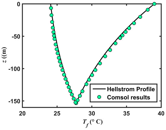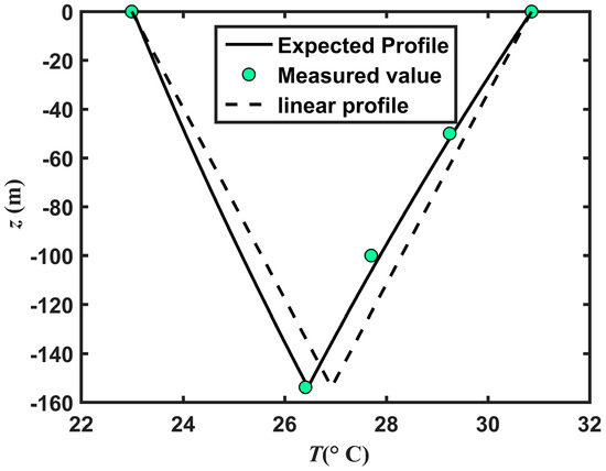 A measurement of a temperature profile along the GHE pipe is of great interest in order to have a better understanding of the heat transfer inside the borehole. Measurements of such temperature profile during TRTs were performed by Fujii et al. [16] and Acuña et al. [17] using fiber optic sensors. Unfortunately, the apparatus to evaluate temperature with optical fiber is expensive. Lamarche et al. [5] suggested an approach that can be used to evaluate these resistances assuming the Hellström profile of Equations (8) and (9). The expressions of the given profile at the bottom and at the exit are given by: