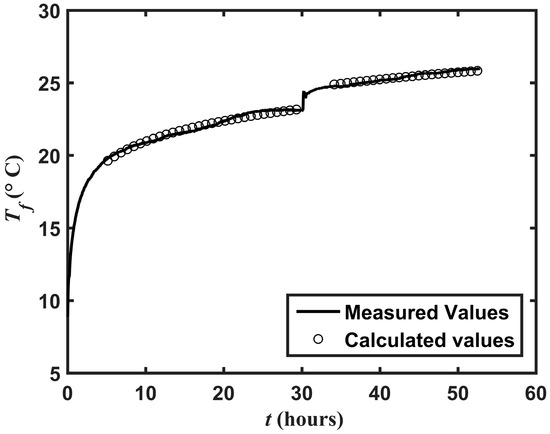 It is clear from Equations (10) and (12) that an increase of the flow rate lowers the effective resistance, which can also decrease if the flow rate diminishes like in Figure 8. A test with variable flow rate was conducted with the same experimental set-up as that presented in the last section. The second test was done three weeks after the end of the first test for the ground temperature to return to its initial condition [18]. The test parameters are the same as those given in Table 1. The heat injection rate was slightly smaller with a mean value of 54 W/m. The flow rate was set at 0.41 l/s for the first 30 h followed by a 23 h period where it was reduced to 0.26 l/s. The Reynolds number during the first part of the test was in the order 18,000, leading to a turbulent flow with a convection resistance of 0.004 mK/W. The flow regime during the second part of the test was still turbulent with a Reynolds number of 11,400 and a convection resistance of 0.003 mK/W. The impact of this convective resistance variation on the total resistance represents a 1% change, which is expected to be smaller than the accuracy at which this parameter can be evaluated. It was, in fact, observed that applying the slope method during data analysis resulted in unrealistic values for the effective borehole resistance. The intercept value from the linear regression in the second part of the variable flow rate test was too sensitive when compared to the noise of the temperature signal. The parameter estimation method was used for the analysis [12]. The same subsurface thermal conductivity as that found in the first TRT was used and only the effective borehole resistance was evaluated. The temperature evolution during the multi-flow test and the one calculated with the borehole parameters found from curve fitting are shown in Figure 9.