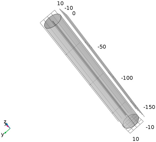 Discrepancies were observed in the first experimental tests between the inferred internal resistance and the ones calculated from the multipole method. A possible explanation is that small variations of the measured temperature can lead to large variations of the internal resistance, especially when the interference effect is small or the short-circuiting resistance is large. A 3D GHE simulation was done with Comsol Multiphysics® 5.2a (COMSOL, Inc., Burlington, MA, USA, www.comsol.com) to provide more insight on the influence of these parameters. The 153 m long borehole was modeled with the Pipe Flow™ module. This module simulates a 1D fully developed flow inside a pipe. The grout region was modeled with a cylindrical solid with known thermal conductivity, whereas the infinite subsurface region was modeled by a finite cylinder of 10 m radius (Figure 10). The effect of the finite region was assumed to be negligible for the short period of time represented by the thermal response test (96 h).