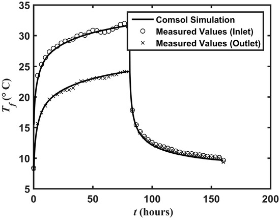 The mesh was refined until no significant variations were observed. The final mesh involved 70,431 elements. The borehole parameters presented in Table 1 were used for the first the numerical simulation. Both the injection and recovery were simulated for the first TRT case. This case was used as a validation of the numerical model. Simulated inlet and outlet temperatures are shown in Figure 11, indicating good agreement between the simulation and the experimental measurements.