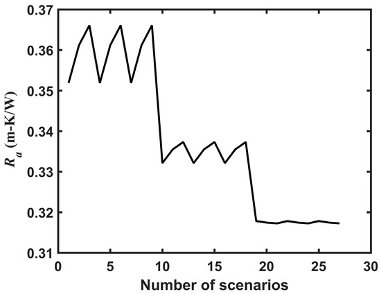 The interference between boreholes is neglected (Tp ≈ 0) and the ΔT at the denominator was set at 10 °C for the sake of simplification. The final length given by Equation (17) depends on the borehole thermal resistance. Different values are possible. A borehole resistance calculated according to design criteria with a method proposed in the literature can be used if no TRT is done. The value would be on the order of the Rb calculated with the mutipole method in Table 9 (Rb = 0.134 mK/W), if a 2D approach is chosen and the method does not take into account the short-circuiting between pipes. The designer can alternatively use the 3D effective resistance if the multipole method is considered and the internal resistance is calculated, which would result in = 0.170 mK/W for conditions of Table 8. A TRT experiment, with the slope method, could be considered if there is uncertainty about the borehole properties (grout thermal conductivity, shank spacing, etc.) and would give Rb = 0.165 mK/W (Table 9). This value is, of course, is similar to that of the multipole method since, in the presented numerical simulation, the borehole parameters are exact. Finally, if an improved TRT analysis as described in Section 3 is performed, the Ra and Rb values given in the 2nd and 3rd columns of Table 9 can use in the design with the inferred or calculated effective resistances (1st and 4th columns), which, of course, are almost the same. This can be interesting if, for some reason, the boreholes that will be installed for the complete bore field have a different length or flow rate than the one use for the TRT experiment. Different sizing scenarios were explored in Table 11, where the impact on the total bore length is illustrated with variations of the total borehole length and flow rate affecting the internal resistance. A total length of 2169 m is obtained for the first case that would be repeated if the internal resistance is not assessed from the TRT or neglected in the calculations. Changes in length or flow rate is then shown to potentially undersizing or oversizing the bore field by an order of 10%, at least for the example provided.