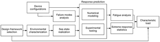 This work was completed in the interest of two related goals. Firstly, this survey should provide researchers and practitioners with some general background on available methodologies for WEC design. Secondly, considering that there are currently efforts underway to create, revise and improve design standards for WECs, this paper should serve as an overview both of the WEC design process as a whole and also specific practices. Due to the short history and limited experience in WEC design, it is essential that all of the available knowledge and understanding of best-practices be used to define standards. An initial review of extreme conditions modeling and design response analysis practices was presented by [8]. Extending the previous work, this paper provides a review and general survey of design practices for WECs, by examining the key components of the WEC design process. A generalized workflow diagram is shown in Figure 1. Working from left to right, this diagram illustrates a major steps in determining characteristic loads for a WEC. This characteristic load, which may be the maximum mooring tension or equivalent fatigue load in a structural member, can be evaluated against structural capacities. The workflow blocks in Figure 1 (design framework selection, device configurations, failure modes analysis, environmental characterization, modeling, experimental testing, extreme response statistics and fatigue analysis) are considered in turn. For each of these areas/blocks, some general discussion of relevant methods is provided, and when possible, studies applying these methods for WECs and related systems are considered.