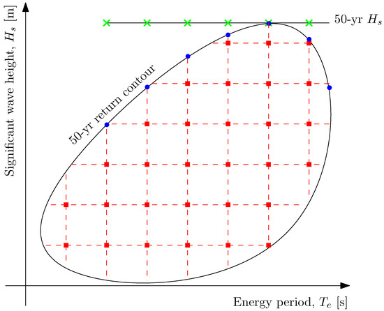 The blue dots in Figure 2 illustrate a contour approach for load case selection. This approach, also commonly referred to as the inverse first-order method (I-FORM), was popularized for ocean systems by Winterstein and Haver [30,31]. Contour analyses have been applied for WECs in multiple studies [29,32] and are suggested for offshore structures in N-003 and DNV-RP-C205. For a desired return period, e.g., 50 years, an environmental contour is determined. Figure 2 shows such a contour in the - (significant wave height and energy period) space. Working along the defined contour, device responses are predicted for a series of environmental conditions. From each of the predictions along the contour, the largest response is taken to be the design response. Correction factors are generally applied to account for short-term variation. This can be accomplished by selecting a high percentile from the short-term response on the contour to represent design load. Within the marine industry, percentiles of 75–99% are often applied [4,29,33,34,35]. An alternative approach is to apply a correction factor to the expected (mean) value from the extreme distribution (Ren et al. [36] suggests a factor of 1.3). This latter approach is attractive since predictions of extreme response distributions often exhibit a large degree of variability in the tail region (see, e.g., [33,37]).