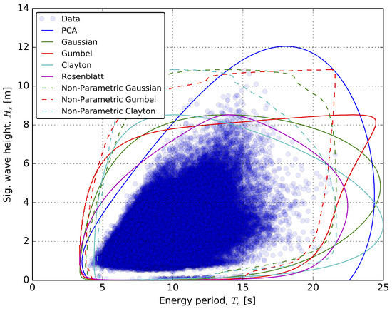Given these challenges, it is clear that characterizing extreme conditions for a specific ocean environment is a nontrivial task. In general for WEC design, as shown in Figure 2, it is desirable to characterize the environment in terms of significant wave height and energy period. While empirical distributions for commonly-occurring sea states can be obtained directly from buoy data or hindcasts, characterizing extreme waves requires extrapolation into the tails of the joint distribution and thus some statistical framework. In their application of the I-FORM, Haver and Winterstein utilized a Ronsblatt transformation so that a desired return period can be used to define a fixed radius sphere within the new space [30,43]. Alternative transformations, such as a Nataf transformation, have also been utilized [44]. Huseby et al. [45] introduced a second class of methods for extrapolating extreme sea states, which rely on Monte Carlo simulation of sea states based on a joint probability model. Vanem and Bitner-Gregersen [46] provided a useful comparison of these two approaches, both in terms of methodology and performance. An improved version of the I-FORM process is presented in [47]. Here, a principle component analysis (PCA) approach is applied to better utilize the physical relationship between wave period and height. Many of these contour methods have been implemented in the open-source WEC Design Response Toolbox (WDRT) [48]. Figure 3 shows an example where the WDRT was used to produce a set of 50-year contours using a variety of methods. From Figure 3, it is clear that these various processes of determining extreme environmental conditions return a wide variety of results.