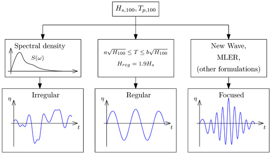Once design cases have been defined, the specifics of realizing the design case, in order to allow for response prediction through experimental testing and modeling (see Figure 1), must be determined. While, as previously discussed, other metocean factors may play an important role for certain devices, we focus here on the definition of a design-wave. The three most common general paths for defining a design-wave are illustrated in Figure 4. The most obvious choice for a design-wave is to use either a representative or idealized spectrum to define an irregular sea state. Alternative approaches, which are generally meant to be more efficient than the “brute force” approach of simulating long irregular wave-trains, are to define representative regular waves or even focused waves based on sea state parameters. This can be helpful, or even essential, when faced with the challenges and time-restraints of high-fidelity modeling and experimental testing.