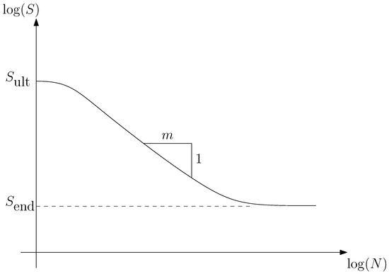 In addition to extreme loads, a WEC must also be structurally able to withstand fatigue loading for its design lifetime. Fatigue loads are time-varying loads, which cause cumulative damage to structural components and eventually lead to structural failure. Usually, a component’s fatigue life/strength is reported in terms of an S-N curve (see, e.g., [100,101]). The S-N curve, which is typically obtained empirically, gives the number of load cycles, N, to failure at constant load amplitude, S, as illustrated in Figure 5. Mathematically, the behavior in Figure 5 is given by, . Here, is the ultimate strength, is the endurance limit below which no failure occurs with constant amplitude loading, m is the slope of the S-N curve and K is an empirical material constant determining the level of the S-N curve.