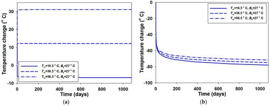 Second, in nearly all of the existing wellbore stability models, such as [23,24,25,26,27,28,29,30,31,32,33,34,35,36,37,38,39,40,41,42,43], the boundary conditions at wellbore wall are assumed to be fixed (especially with a fixed wellbore temperature) or given in an arbitrary way. Obviously, this does not reflect the real wellbore conditions where the temperature changes with fluid circulation or drilling time. This simplification can lead to under- or over-estimation on the near-well stress field. Circulation of a fluid with a temperature lower than the formation temperature leads to a gradual reduction in both the bottom-hole temperature and the near-wellbore compressive stresses. The temperature at most locations along the wellbore also reduces with time. As different temperatures at the wellbore wall generate different heat transfer efficiencies in the formation, the time-dependent response of the wellbore wall temperature should be considered.