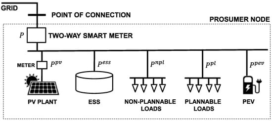 This study takes as reference scenario a prosumer node connected to the electricity grid and equipped with consumption, generation, and storage resources (Figure 1). Notable devices inside the prosumer node include: the loads, the ESS, the PEV, the PV plant, the smart meter, and the smart plugs. The main actors involved in the EMS problem are: (1) the distribution system operator (DSO), which establishes the node power limits; (2) the retailer, which has an energy contract with the user; (3) aggregators, mediating between the node and the previous actors in case the node is part of a wider energy community; and (4) other service providers (e.g., PV forecasting providers).