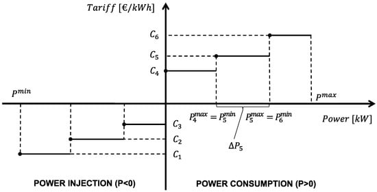 The tariff scheme adopted in this paper is a combination of the two models. It is mathematically described as a function , where k is the time and  the power exchanged with the grid at k (see example in Figure 2). C is assumed to be piece-wise constant in the power interval , being  the injection power threshold and  the consumption power threshold of the node.  denotes the energy tariff value at time k for the generic jth power interval  in which the tariff function is constant with respect to the power variable. The dependence of C on time allows to integrate time varying pricing models. The dependence on the power level allows to include the capacity models.