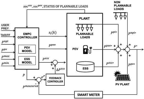 The controlled plant here is given by the plannable loads, the ESS, and the PEV. The control signals computed through EMPC are: the starting times of the plannable loads, the ESS and the PEV control signals. Furthermore, at each time k the EMS retrieves the state of all the plannable loads currently controlled (started or not-started; non-started loads can be re-scheduled) and the SOC of the ESS and the PEV. The EMPC controller takes the following further inputs: (1) new user requests; (2) updates of the tariff (in the case of real-time pricing); (3) updates of the node power limits (in the case of DR); (4) updates of the PV forecasts; and (5) updates of the loads’ forecasted consumption profiles.