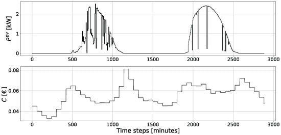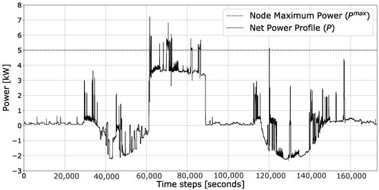 - Real generation and consumption data are used [], with high time resolution (1 to 6 s) and high granularity in terms of monitored loads (53 monitored loads, plus the node meter). This makes the simulations more realistic compared to previous works, where the data used in the simulations are mostly 15-min based, if not in the order of half-hour periods. This is relevant, because the metering data show that the PV output and the load curves of the appliances can have significant variations in the time frames on the order of the seconds. Similarly, the load profiles are real ones, and so are the associated request times. This makes the simulations very realistic, because they are based not only on real data, but also on real dynamics of the household (as a matter of fact, one of the complexities of building the simulation setting has been that of acquiring and isolating from the data repository provided in [] all the load profiles occurring during the simulated time frame).