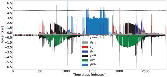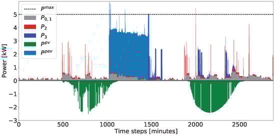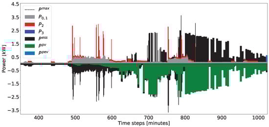 where , , ,  and  are, respectively, the power from non plannable loads, from plannable loads, from the ESS, from the PEV and from the PV panel.